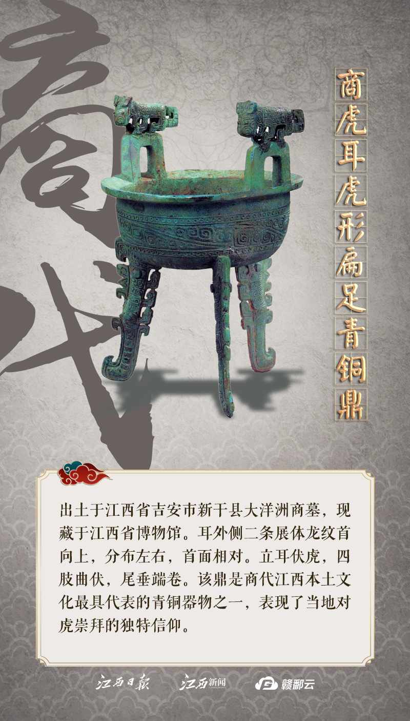 作为古代军武的象征、避邪驱灾的神兽,虎的形象曾出现在青铜器、玉石和陶瓷等各式各样的文物上,衍生出图腾信仰、军武权威等不同形式的虎文化元素。今年是虎年,不少博物馆都推出了与虎相关的文物特展,例如江西省博物馆展出的“虎耳虎形扁足铜圆鼎”“龙泉窑堆塑虎纹烛台”,南昌汉代海昏侯国遗址博物馆中展出的憨态可掬的“青铜虎”……让我们一起探寻江西的“虎文物”,感受江西文物不一样的魅力。