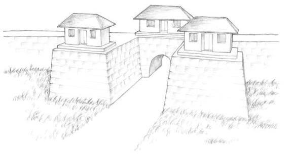 2015 年至2017 年,联合考古队在陶寺宫城的南墙上还发现两处⻔址。位于南墙偏东的“阙楼式”⻔址,复原以后有点像故宫的“午⻔”。隋唐时期洛阳城的“应天⻔”也是这样的“阙楼式”⻔址,但是4000多年前史前时期的陶寺,就已经出现了这⼀类的⻔址。