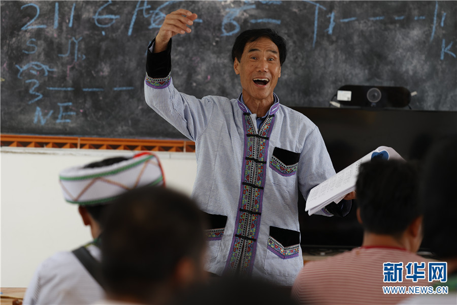 赵科老师正在教村民唱傈僳族民歌。新华网 丁凝 摄