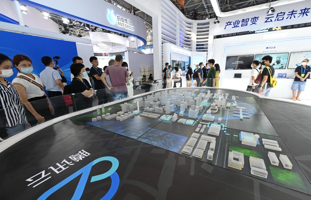 观众在第五届数字中国建设成果展览会上参观腾讯云全栈解决方案沙盘(7月23日摄)。