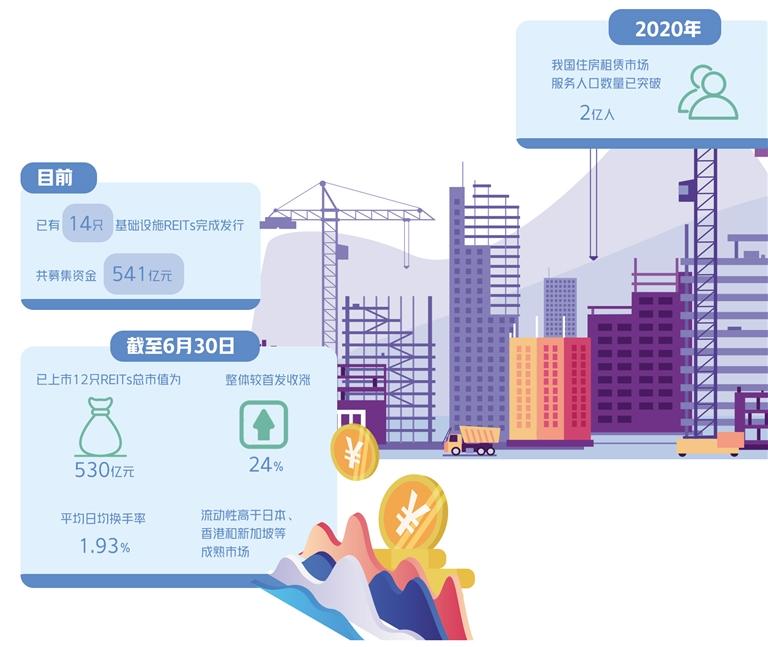 目前,我国REITs试点工作推进顺利,市场初具规模。截至目前,已有14只基础设施REITs完成发行,共募集资金541亿元;截至6月30日,已上市12只REITs总市值为530亿元,整体较首发收涨24%;平均日均换手率1.93%,流动性高于日本和新加坡等成熟市场。