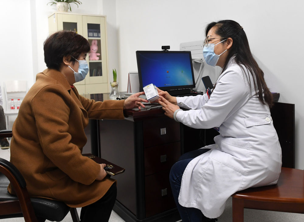 2月21日,在广西壮族自治区妇幼保健院,杜丽群(左)向阮毅燕医生了解罕见疾病用药及其价格情况。新华社记者 陆波岸 摄