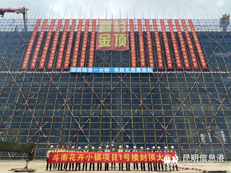 昆明信息港讯 记者段佳琪 通讯员赵玉芳 8月1日,在云南省重点工程——昆明斗南花卉小镇项目施工现场,混凝土浇筑、振动棒、平板振动器等的火热施工声此起彼伏,十几辆混凝土罐车来回穿梭。在工人们长达20个小时的连续浇筑作业后,8月2日凌晨5点30分,该项目终于迎来首栋楼的封顶,为项目年底全面封顶打下坚实基础。