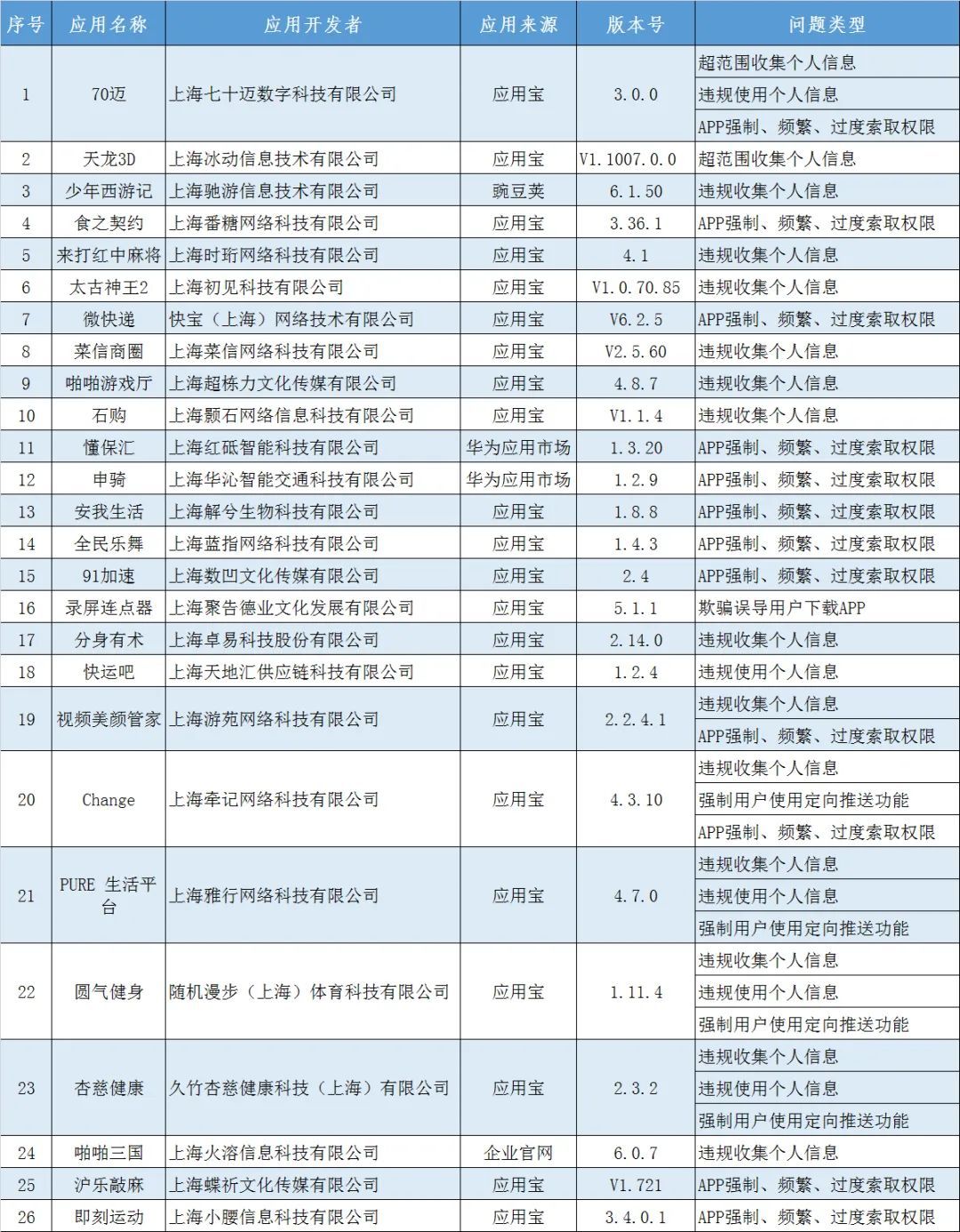 上海市通信管理局指出,截至目前,尚有26款APP未完成整改,上述APP应在8月2日前落实整改工作。逾期不整改的,上海市通信管理局将依法依规组织开展处置工作。