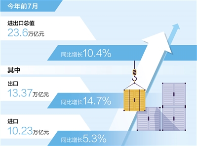 据海关统计,今年前7月,我国进出口总值23.6万亿元,比去年同期增长10.4%。其中,出口13.37万亿元,同比增长14.7%;进口10.23万亿元,同比增长5.3%。