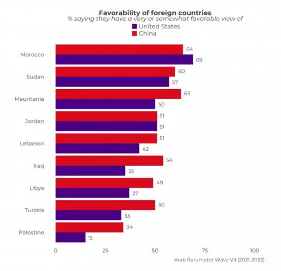 这项民调显示,在这9个国家中,只有在对中美两国的好感度均为最高的摩洛哥,民众对美国(69%)的好感度略高于中国(64%)。约旦对两国好感度都为51%。其他7个国家对中国的好感度都超过美国。苏丹对中美两国的好感度分别为60%和57%,中国领先3个百分点;中国在黎巴嫩的好感度为51%,美国(42%)落后中国9个百分点。在其他几个国家,中国优势更为明显:美国在利比亚的好感度为37%,落后中国(49%)12个百分点;毛里塔尼亚对中美两国的好感度分别为63%和50%;突尼斯的该数字分别为50%和33%,在伊拉克分别为54%和35%,在巴勒斯坦分别为34%和15%。
