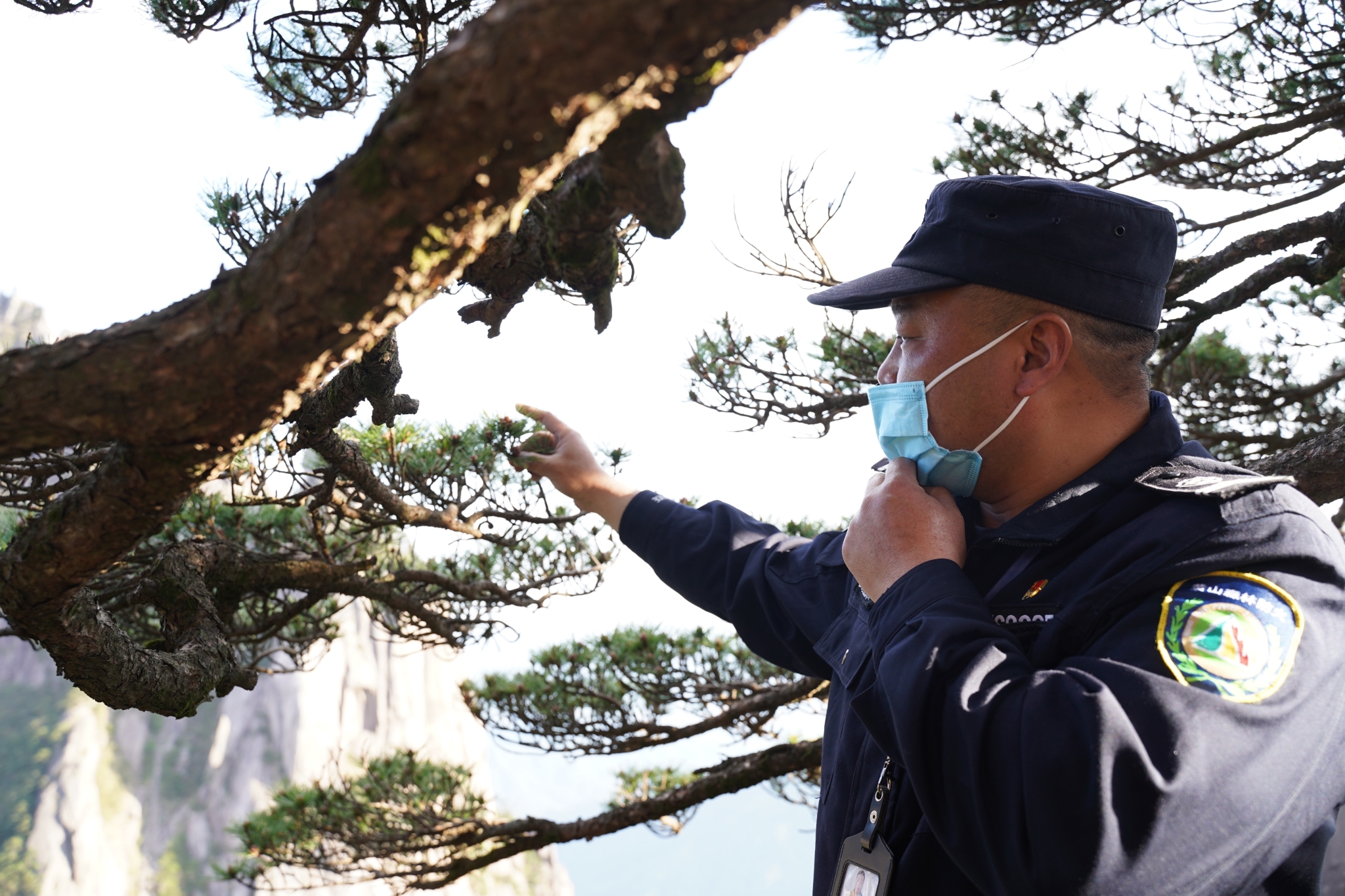 守松的日子里,一年365天,胡晓春有300天要在迎客松前打卡:除了观察树皮、梢头、枝丫、冠顶之外,每天的巡检细到连松针都不放过。