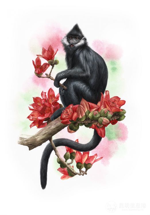 许宁,木棉花树上的黑叶猴,55x38cm,水彩,2022