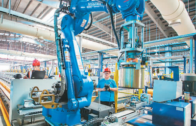 今年以来,山东省东营市广饶县开展产业智慧赋能升级行动,结合“优势产业+人工智能”,抓好15个智能化改造项目,新建智能工厂、数字化车间,提升产业自动化、信息化、集成化制造水平。图为在山东兴达钢帘线有限公司智能化设施升级改造项目的湿拉车间,技术人员调试工业机器人。刘云杰摄(人民视觉)