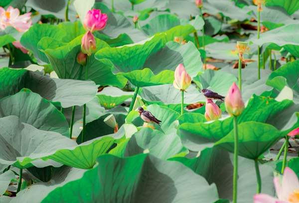 荷花绽放,四溢幽香,引来众多小鸟伫立花尖,飞行穿梭在荷花丛中,或飞翔嬉戏,或停留小憩,成为赏荷的一道独特亮丽风景。
