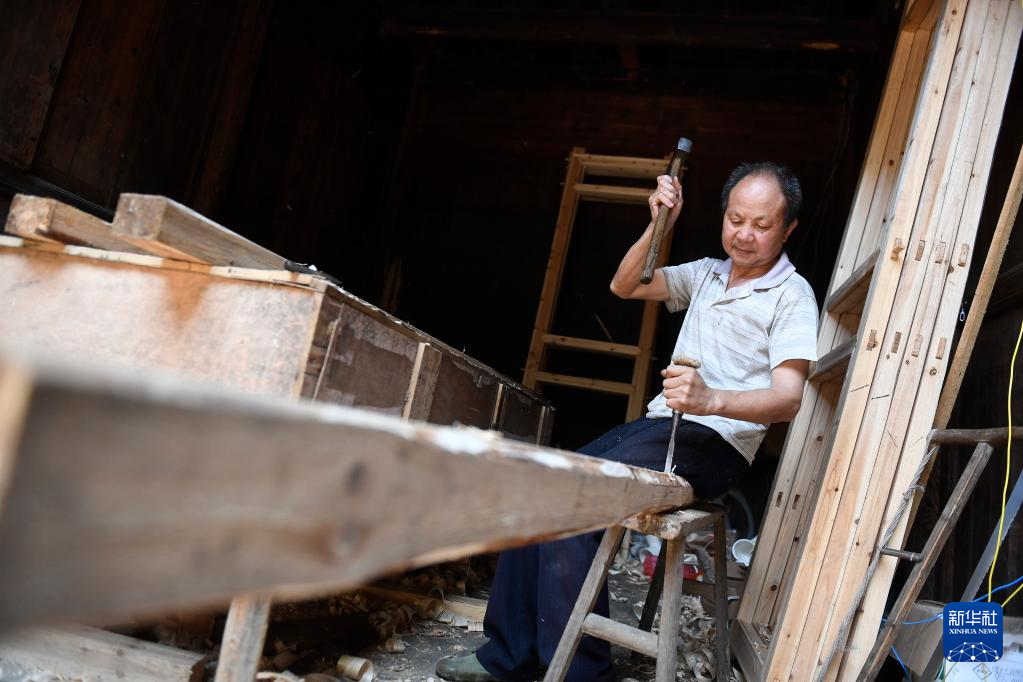 在浙江省松阳县三都乡杨家堂村,负责修复一古民居的工匠在制作木门(2018年5月25日摄)。新华社记者 黄宗治 摄