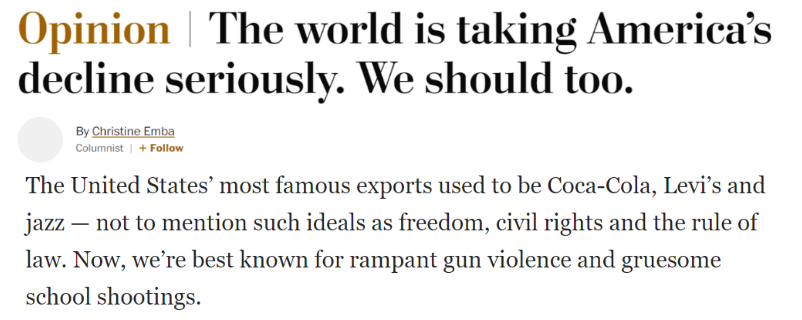 《华盛顿邮报》发表题为《世界正在认真对待美国的衰落 我们也应该》的评论文章