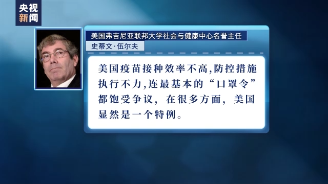 美国弗吉尼亚联邦大学社会与健康中心名誉主任史蒂文·伍尔夫称,这是历史性的降幅。谈及美国疫情防控与其他国家的差距,伍尔夫这样说:美国疫苗接种效率不高、防控措施执行不力、连最基本的“口罩令”都饱受争议,在很多方面,美国显然是一个特例。