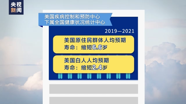 美国疾病控制和预防中心下属全国健康状况统计中心发布的报告显示,2019年至2021年,美国人均预期寿命下降了2.7岁。报告认为,新冠疫情是导致美国2021年人均预期寿命缩短的首要原因。