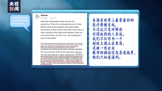 有网友讽刺道:美国有世界上最贵最好的医疗保健系统,不过这只是对那些付得起钱的人来说。我们不仅作为一个超级大国正在衰退,还被一些企业散布的错误信息急速拖累,他们只知道谋利。