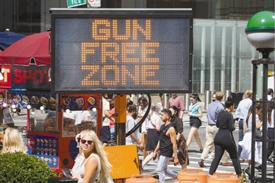 美国纽约市地标时报广场9月1日起正式成为“禁枪区”,以执行纽约州一项于当天生效的枪械管控法律。根据这项法律,普通公民不得携带枪支进入纽约州辖区内公园、教堂、剧院、学校、地铁、游乐场等“敏感”场所。图为近日,人们从美国纽约时报广场邻近街区的“禁枪区”标志牌旁走过。郭克摄(新华社发)
