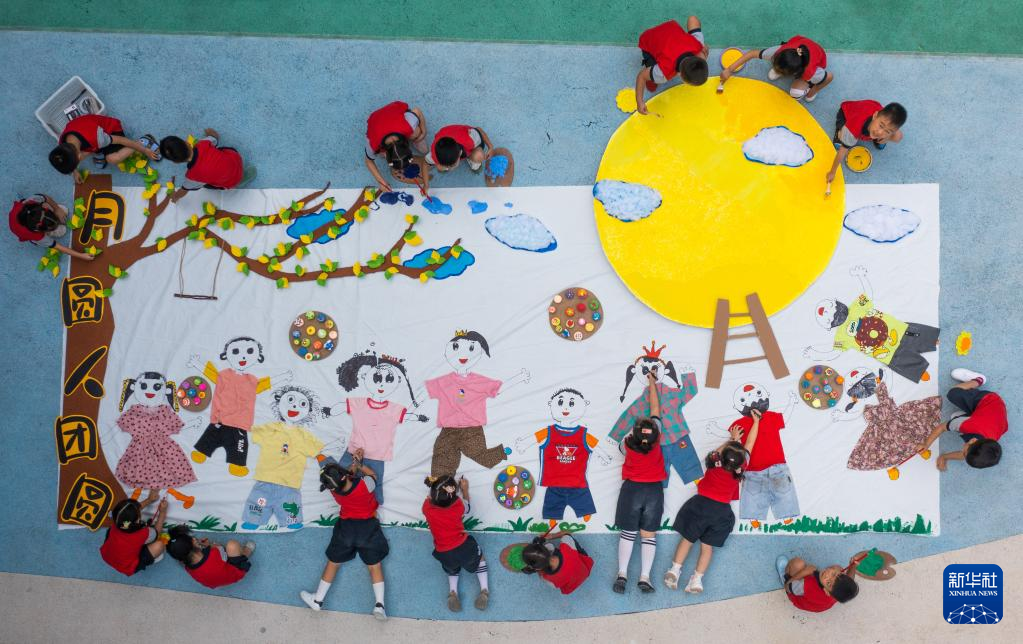 9月8日,长桥中心幼儿园的孩子们在老师的带领下用废旧衣物等创作“月圆人团圆”环保创意画(无人机照片)。新华社记者徐昱/摄