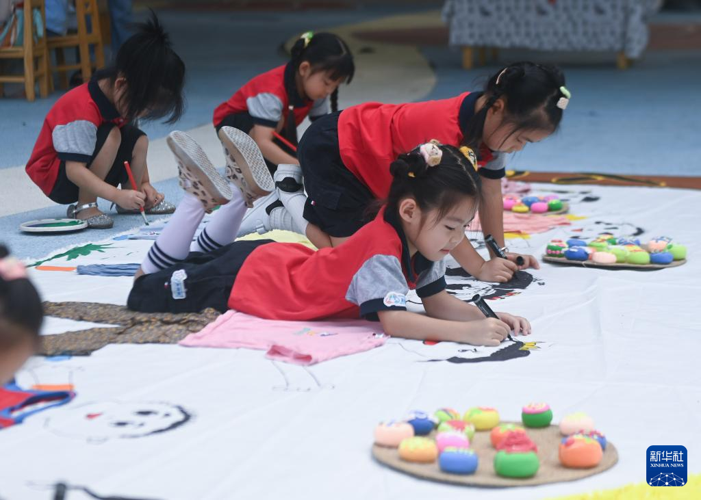 9月8日,长桥中心幼儿园的孩子们在老师的带领下用废旧衣物等创作“月圆人团圆”环保创意画。新华社记者徐昱/摄