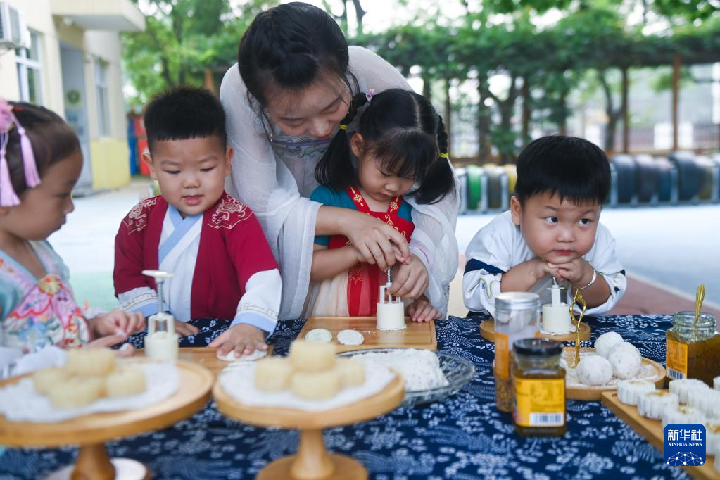9月8日,长桥中心幼儿园的孩子们在老师的带领下自制桂花月饼。新华社记者徐昱/摄