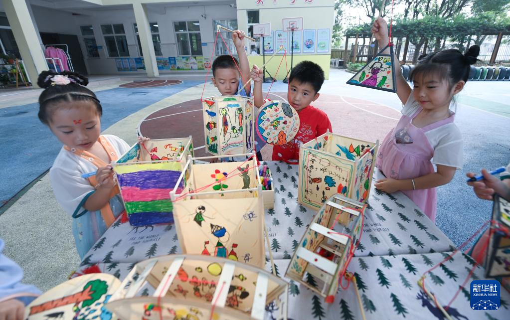 9月8日,长桥中心幼儿园的孩子们展示自己制作的中秋花灯。新华社记者徐昱/摄
