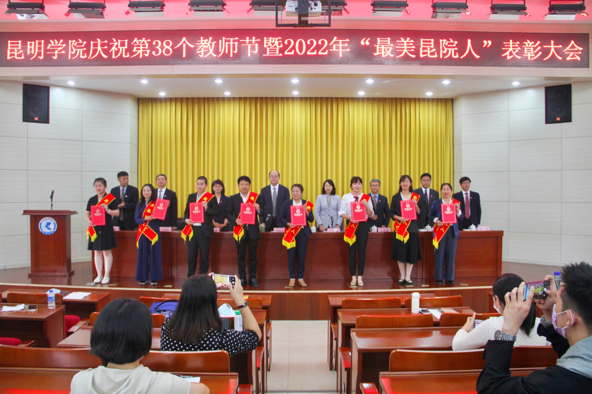 会上宣读了“最美昆院人”表彰决定,对评选出的教书育人奖4人、科研贡献奖4人、管理服务奖2人、优秀辅导员奖2人、优秀学子奖3人予以表彰。校领导为受表彰的老师、同学颁发荣誉证书。
