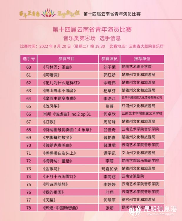 根据当前疫情防控工作需要,本次比赛通过线上线下结合的方式举办。为最大限度满足观众的观演需求,各场比赛将通过新媒体平台进行网络直播,广大观众可通过昆明剧院官方公众号了解各场次比赛日程,并在公共文化云、七彩云端、昆明剧院视频号、昆明剧院抖音号等直播平台观看精彩演出,用点赞和评论的方式为我省优秀青年演员加油助威。
