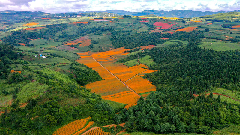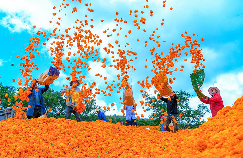 秋收时节,云南省红河哈尼族彝族自治州弥勒市东山镇山涧中万亩连片的万寿菊宛如橙色地毯,成为乡村间一道亮丽的风景线。农户抓住好天气抢采收,一派丰收繁忙景象。近年来,该市在9个乡镇种植万寿菊4.3万多亩,预计今年可实现粗加工产值1.3亿元。