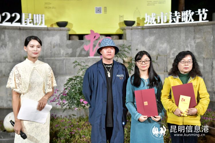 昆明信息港讯 记者王奕然 “我宣布,‘虹——2022昆明城市诗歌节’顺利闭幕!”9月25日晚,随着大益文学院院长陈鹏宣布闭幕,“虹——2022昆明城市诗歌节”在昆明世博园上海明珠苑落下帷幕。闭幕仪式上,公布了“褐石杯”征文大赛获奖结果,共有6位来自云南各地的诗人获奖。