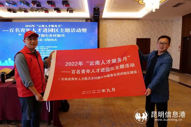 云南省人社厅人力资源流动管理处处长曾辉宣布主题活动正式启动,并向人才服务团授旗。