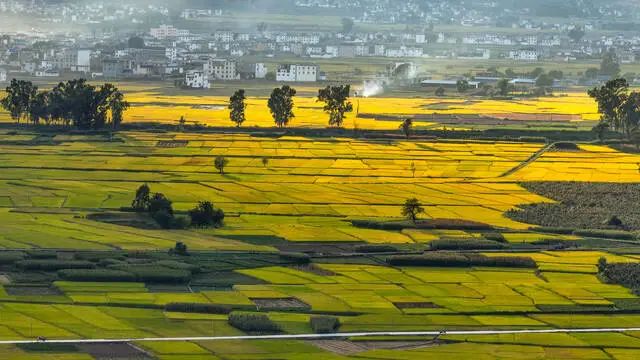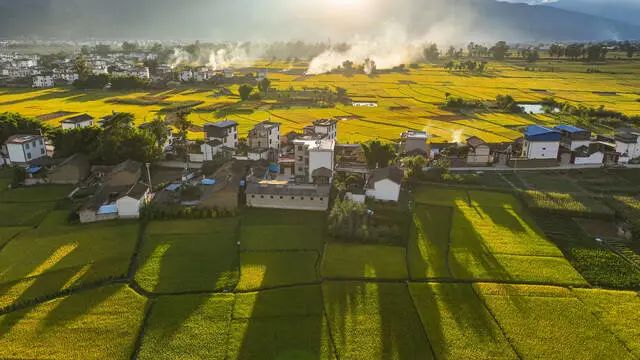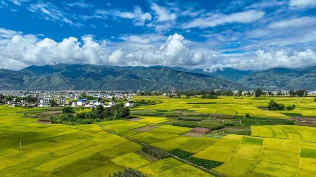 九月的永胜县三川坝子,蓝天下,金黄的稻田层层叠叠铺展开来,青山依依,白墙青瓦,袅袅炊烟……在清秋的薄雾中,如一幅隐入烟尘的写意水墨画。
