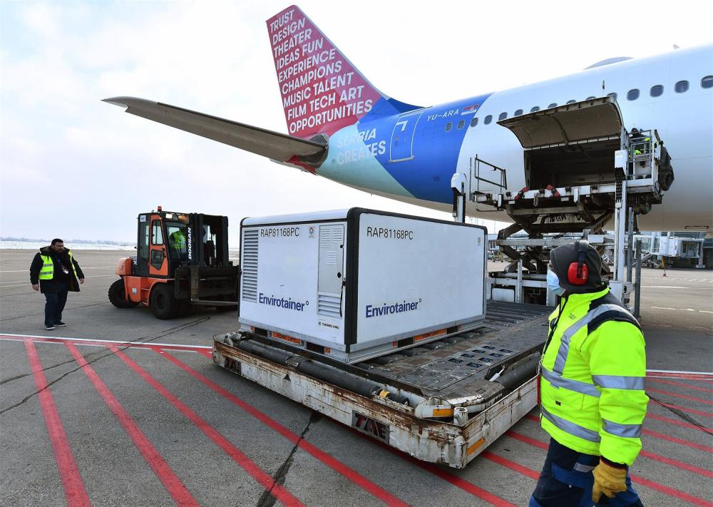 2021年1月16日,在塞尔维亚首都贝尔格莱德,机场工作人员卸载由中国国药集团生产的新冠疫苗。新华社发(普雷德拉格·米洛萨夫列维奇摄)