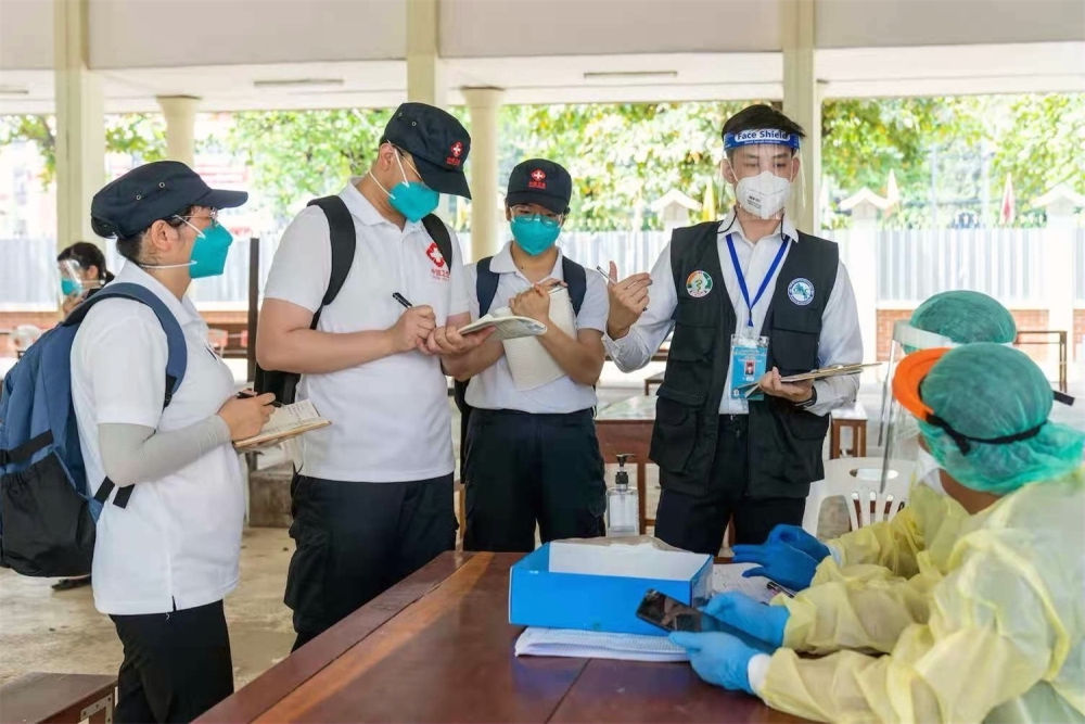 2021年5月7日,中国政府医疗专家组在老挝首都万象考察一个新冠病毒采样点,了解采样流程、信息采集、密切接触者判定标准和环境消毒等情况。新华社发(中国政府医疗专家组供图)