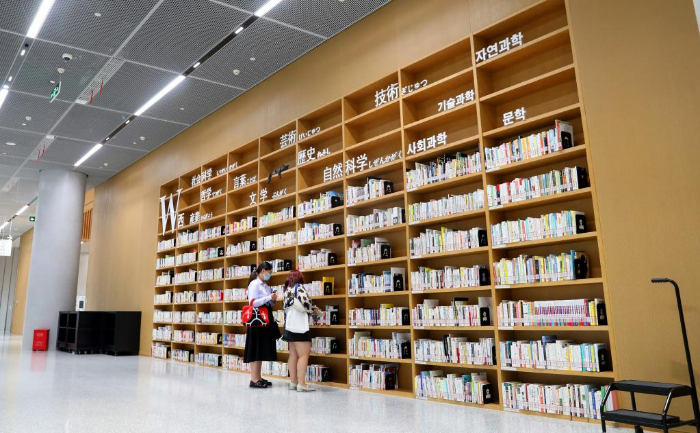 9月28日,读者走在上海图书馆东馆智能书架区内。