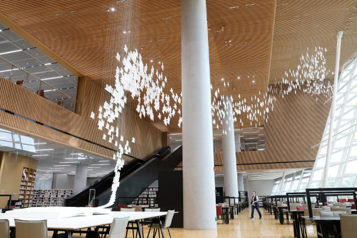 9月28日在上海图书馆东馆南阅读广场内拍摄的名为《鸟飞了》的艺术作品。