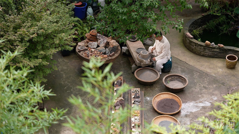 泡茶清甜甘冽,蓄茶久贮不易。紫砂铭壶以其独有的双气孔结构,备受历代文人雅士青睐,其中尤以黄龙山泥料制成的紫砂铭壶为上品。华昱幼时,常随着“泥痴”外公赴黄龙山采石,早早就对紫砂泥三大石料:紫泥矿、绿泥矿、红泥矿,及“牵磨—过筛—过滤”这套紫砂泥制作流程熟稔于心。但尽管熟悉,彼时的他对其却无甚兴趣,“成天只顾着玩”,让父母对其未来颇为忧心。