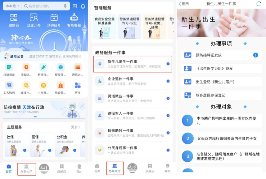 以前,如果家里迎来新生儿宝宝,家长往往要去医院、社区、派出所跑四五趟,需要两三天才能办完出生证明、落户口、参加医保等手续。现在,只要手机登录“津心办”APP办理这些手续,再也不用跑腿,一天就能全部办妥!市委网信办、市政务服务办、市大数据管理中心共同从群众办事视角出发,持续推动系列“一件事”数字化政务服务,于近期在“津心办”APP上线试运行第一批9项“一件事一站办”场景,将跨部门业务以主题为牵引再造线上流程,用数据跑路代替群众跑腿,让市民获得更多智慧便捷、省时省力的办事体验。