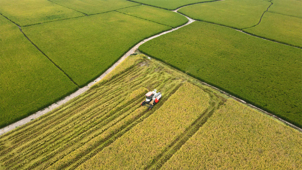 2022年9月28日,合肥市肥西县花岗镇河丰社区村民驾驶收割机收获中稻(无人机照片)。新华社发(徐勇摄)