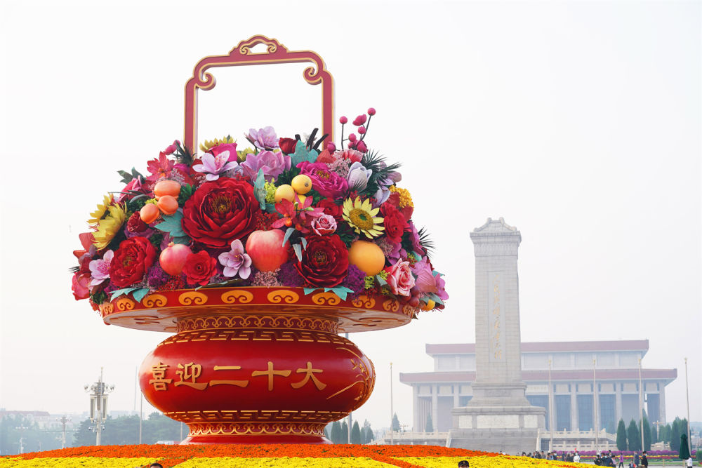 天安门广场上,不少游客围着18米高的巨型花果篮拍照留念。篮体上标注的“祝福祖国”“喜迎二十大”大字,贴切地表达着人们此刻的心情。