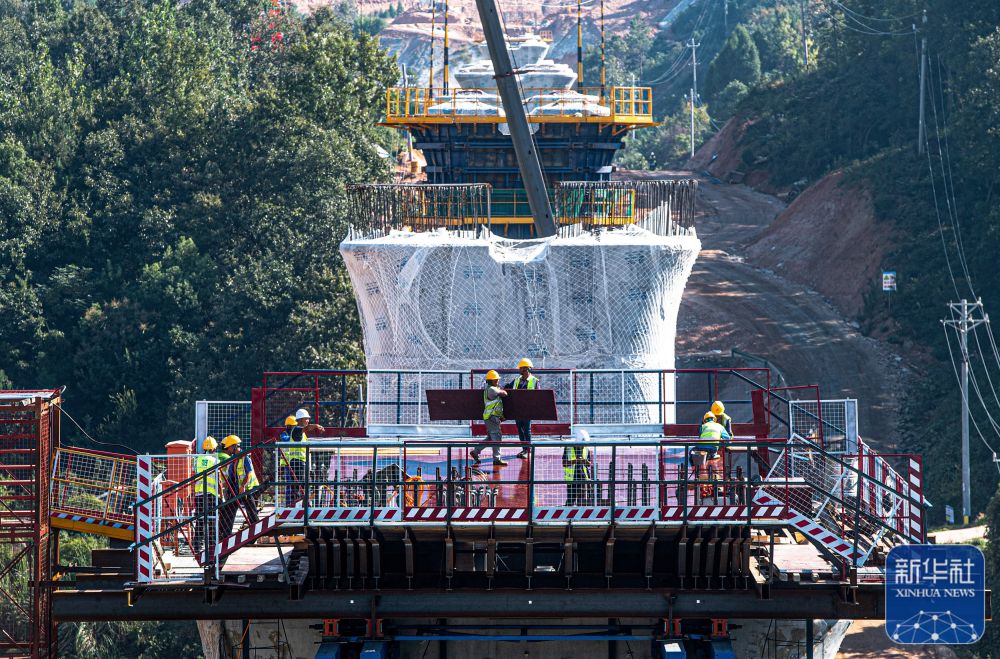 10月2日,中铁七局工人在沪渝蓉高铁武宜段龙泉河特大桥施工现场作业。新华社记者 肖艺九 摄