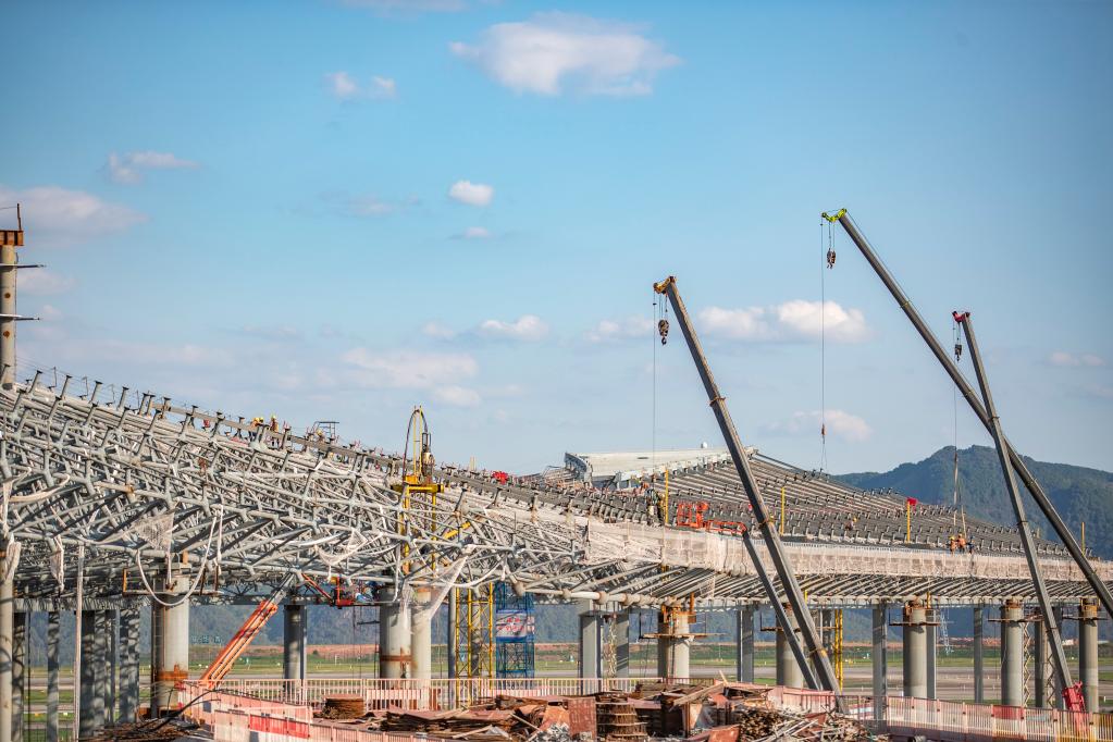 10月1日,在中建八局承建的重庆江北国际机场T3B航站楼施工现场,上千名建设者坚守岗位作业。新华社记者 黄伟 摄