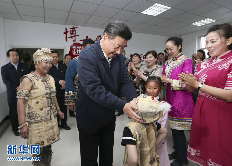 2016年5月23日至25日,中共中央总书记、国家主席、中央军委主席习近平在黑龙江考察调研。这是5月24日下午,习近平在佳木斯市同江市八岔赫哲族乡八岔村同正在进行伊玛堪说唱教学的村民们亲切交流。 新华社记者 兰红光 摄