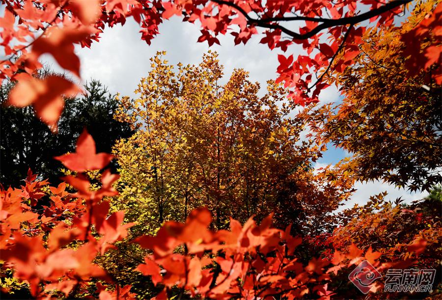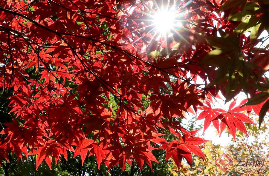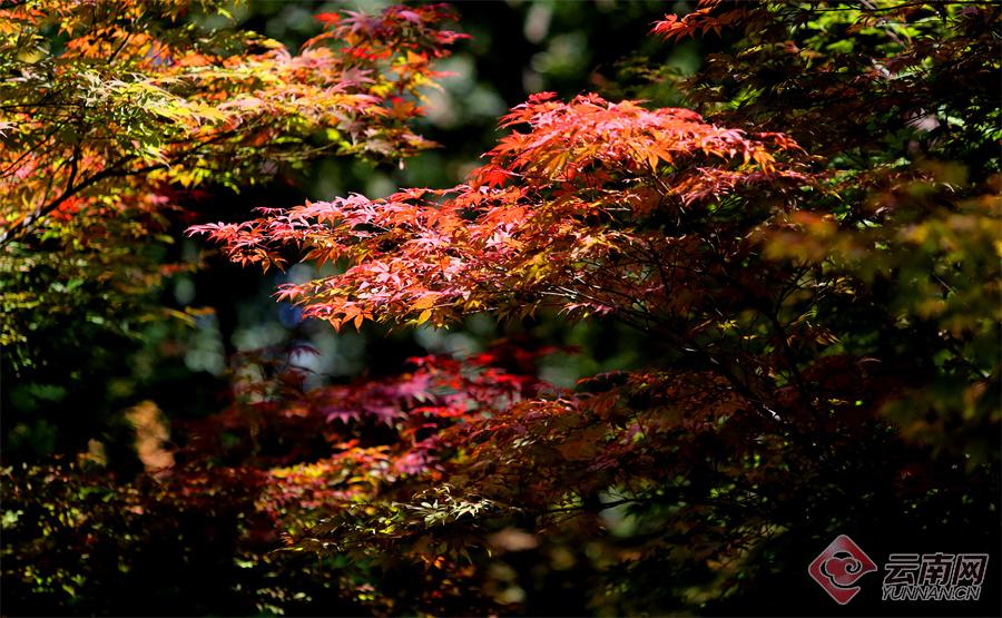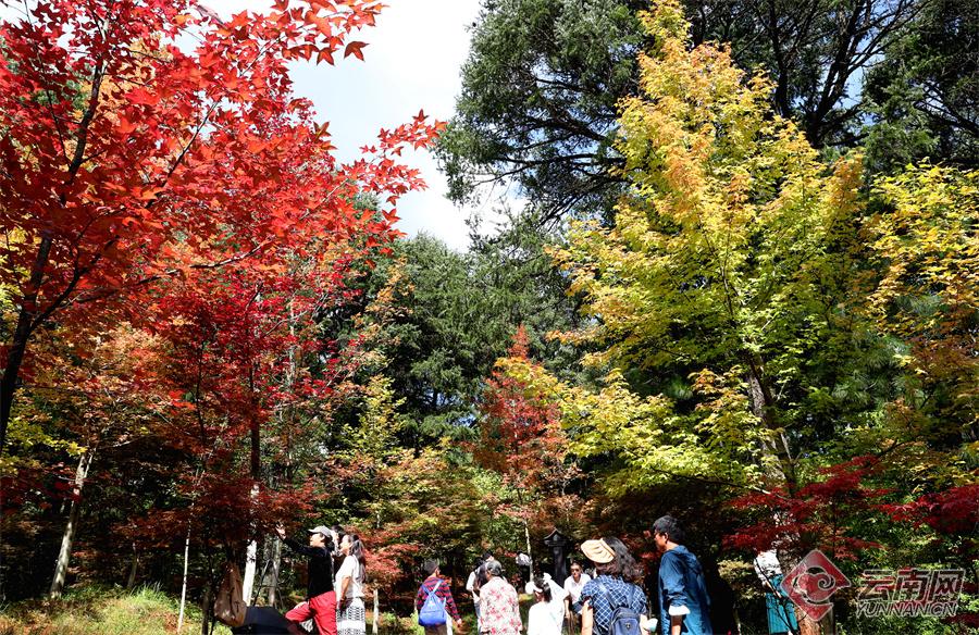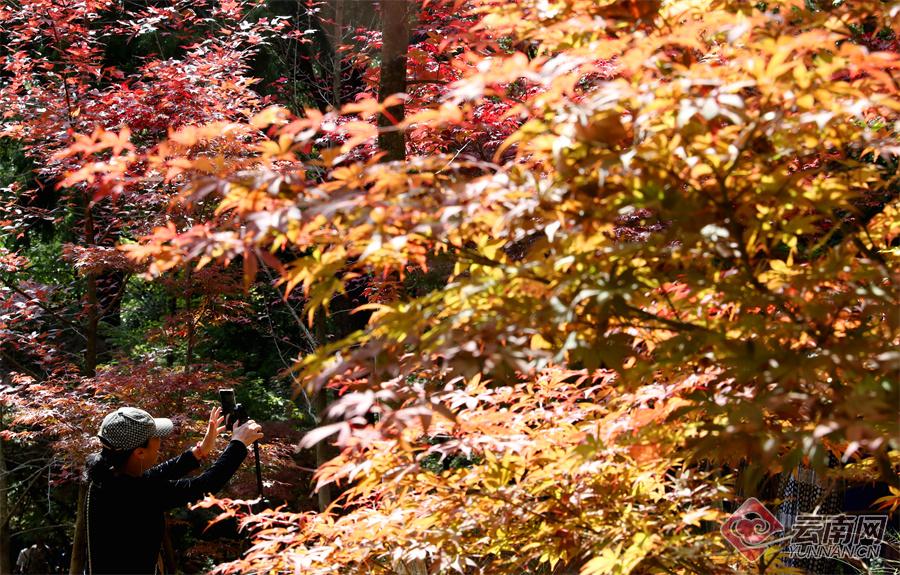 10月4日,国庆假日与重阳佳节“喜相逢”,昆明黑龙潭公园的红枫景观也进入了最佳观赏期,枫香、槭树、红枫等观叶植物在阳光照射下黄得鲜亮、红得艳丽,让整个山岭层林尽染,呈现色彩斑斓、娇艳夺目的秋日美景。
