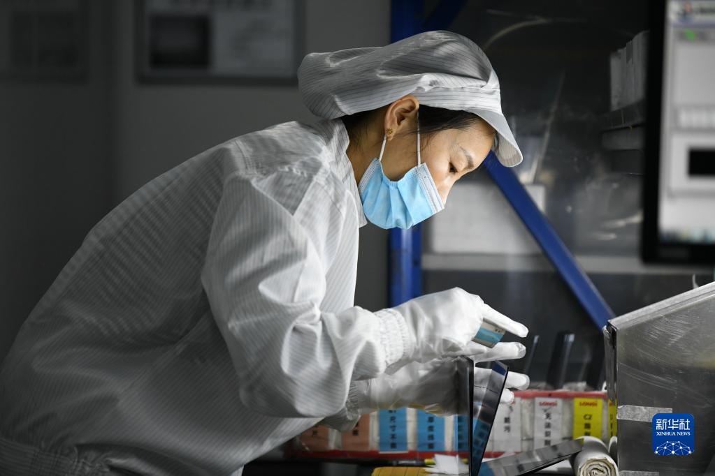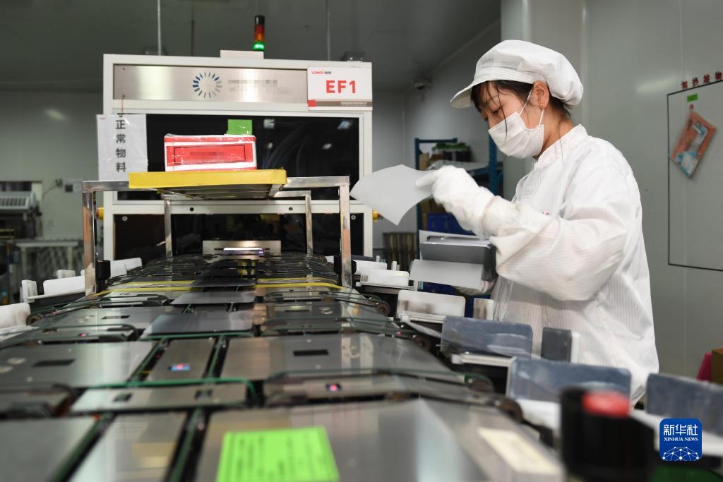 在隆基绿能科技股份有限公司西安切片工厂,工人在进行检测包装作业(2022年1月18日摄)。新华社记者 李一博 摄