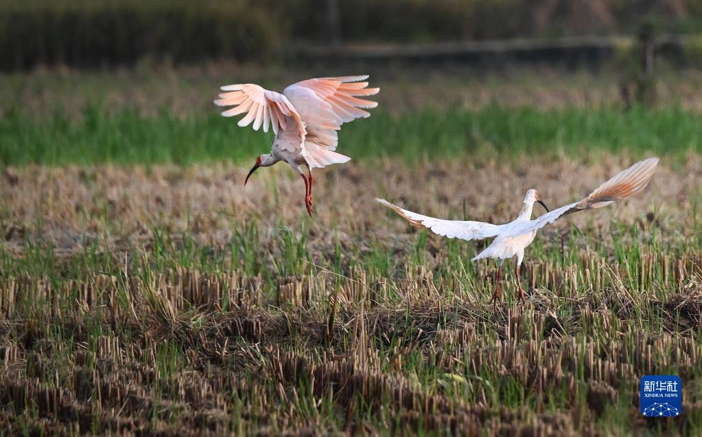 陕西汉中朱鹮国家级自然保护区管理局局长牛克胜走在前面,顺着他手指的方向,记者看到刚刚完成采收的稻田里有朱鹮成群结队地落下觅食,频频还有白鹭、苍鹭飞过。
