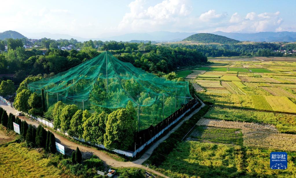 位于汉中市洋县的陕西朱鹮人工繁育中心放飞大笼(2021年5月12日摄,无人机照片)。新华社记者 陶明 摄