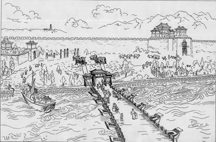 这是蒲津渡浮桥繁盛图。(资料图片,由蒲津渡遗址博物馆提供)