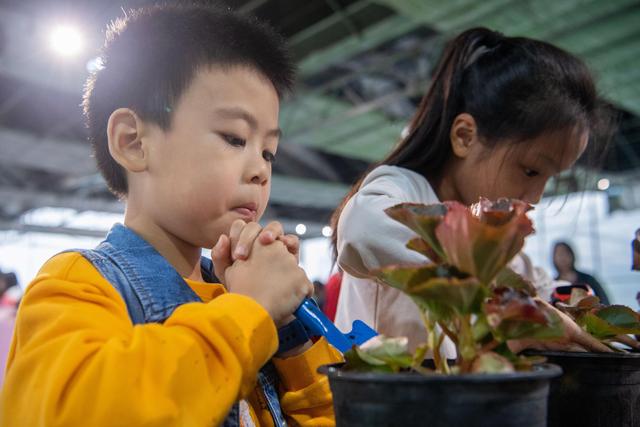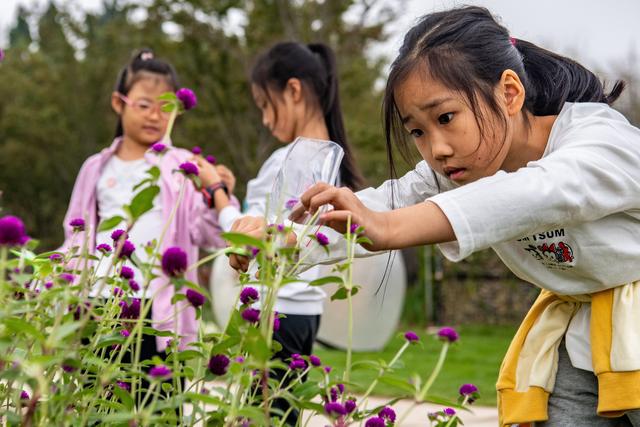 10月5日,小朋友在辨认鲜花。