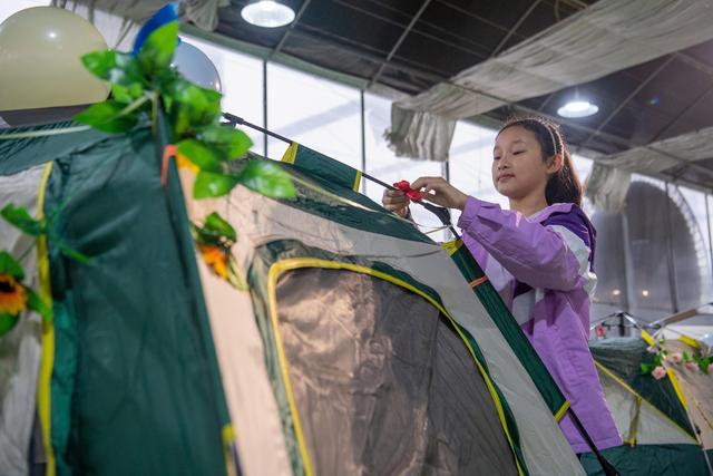 10月5日,小朋友在布置帐篷。