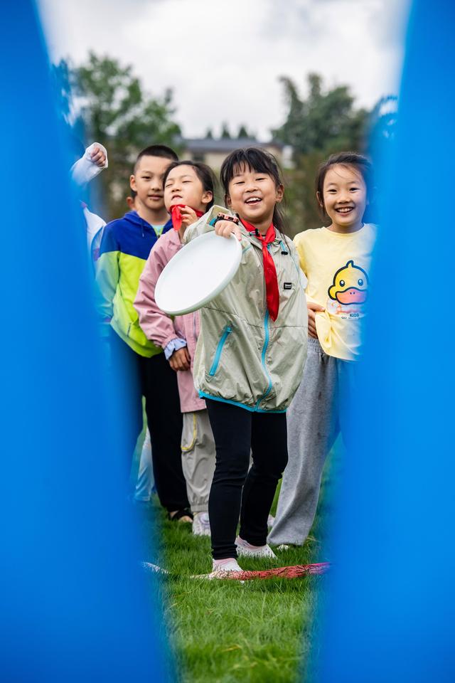 10月4日,小朋友在草坪上扔飞盘。