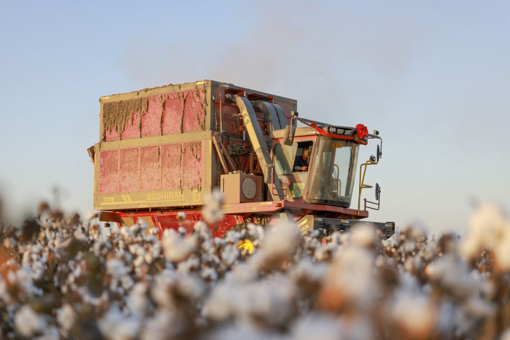 ↑2022年9月26日,新疆阿克苏地区沙雅县塔里木乡其格格热木村村民黄清顺开着新买的采棉机采收棉花。新华社发(柳玉柱 摄)